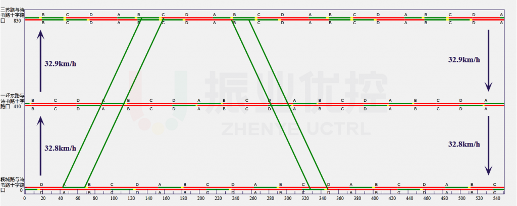 2.经过分析计算,诗书路北段(裴城路至红星西路)协调周期110秒,南段(环湖路至一环南路)协调周期115秒,均采用小周期控制,以下为绿波协调时距图。