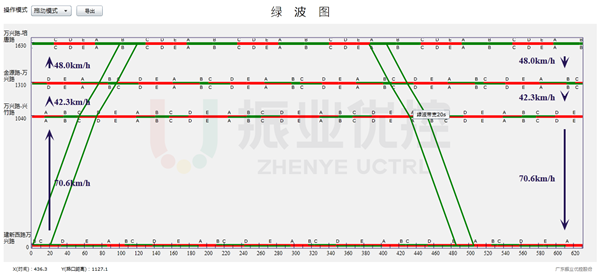 4.设计双向绿波协调方案。平峰时段(9:00-17:00),对万兴路(培唐路-建新西路)实施双向“变速”绿波协调控制。协调路段上下行绿波带宽均为20秒。