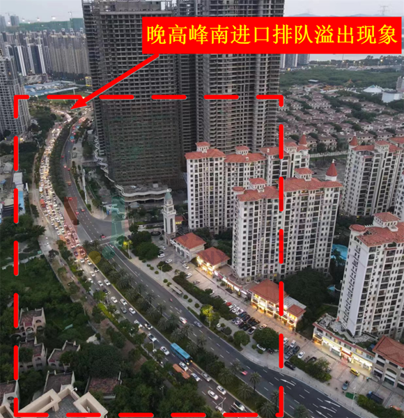 晚高峰时段,西进口车流聚集较快,现有车道通行能力难以及时消散大量聚集车流,呈现过饱和状态。另外,由于该进口段存在小区出入口车流干扰,出现车流“断流”与排长队现象,排队长度超过500米,经常排队到中山东路下匝道处,影响主路正常通行。